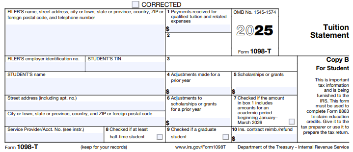 The 1098-T form reflects account activity during the calendar year for the tax statement. For example, a 1098-T form sent in January 2026 includes payments made January-December 2025 to be reported on 2025 taxes.